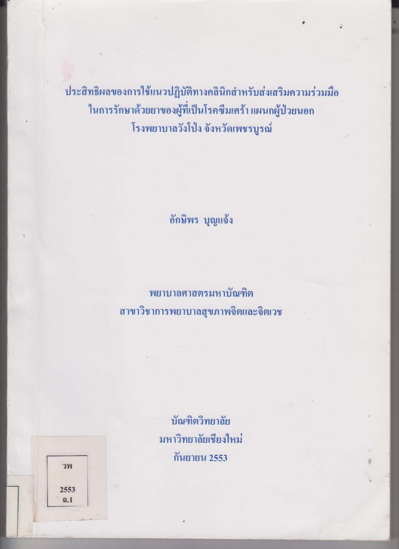 ประสิทธิผลของการใช้แนวปฏิบัติทางคลินิกสำหรับส่งเสริมความร่วมมือในการรักษาด้วยยาของผู้ที่เป็นโรคซึมเศร้า แผนกผู้ป่วยนอก โรงพยาบาลวังโป่ง จังหวัดเพชรบูรณ์/bEffectiveness of Implementing Clinical Practice Guidelines for Enhancing Medication Adherence of Persons with Major Depressive Disorders, Outpatient Department, Wangpong Hospital, Phetchabun Province/อักษิพร บุญแจ้งลอย |