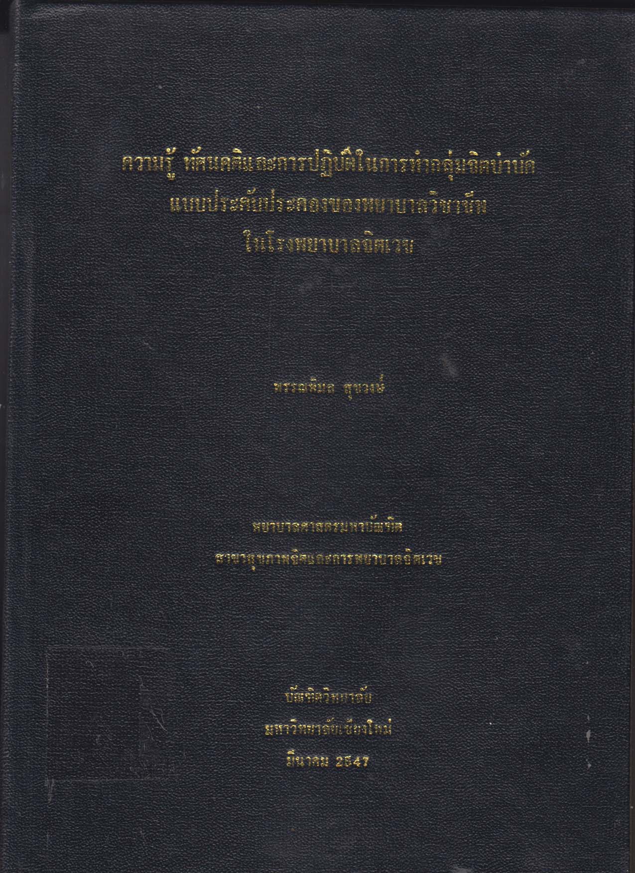 การค้นคว้าแบบอิสระ(พยาบาลศาสตรมหาบัณฑิต(สาขาวิชาการพยาบาลจิตเวชและสุขภาพจิต)) -- มหาวิทยาลัยเชียงใหม่ |