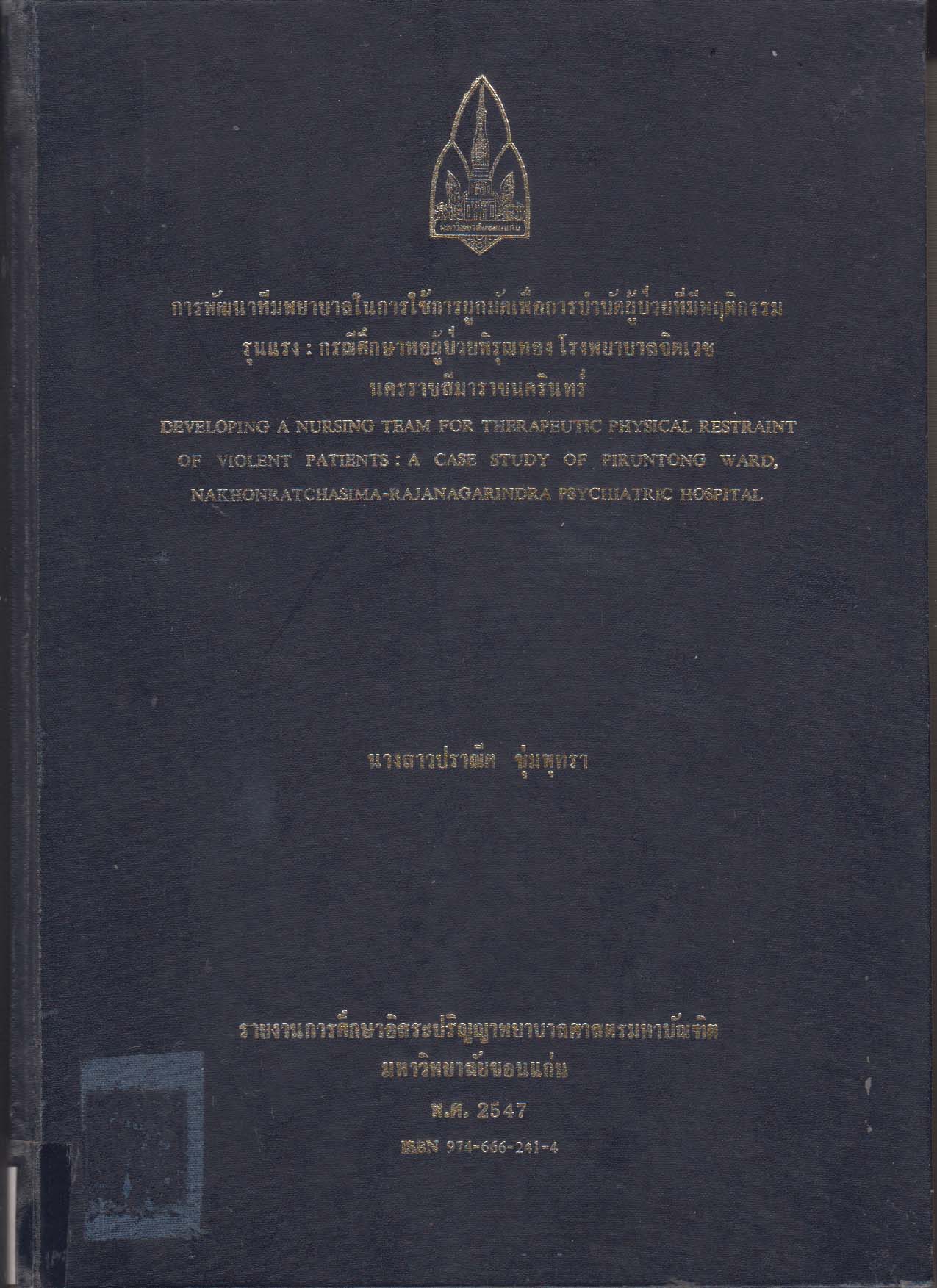 การพัฒนาทีมพยาบาลในการใช้การผูกมัดเพื่อการบำบัดผู้ป่วยที่มีพฤติกรรมรุนแรง : กรณีศึกษาหอผู้ป่วยพิรุณทอง โรงพยาบาลจิตเวช นครราชสีมาราชนครินทร์/bDeveloping a Nursing Team for Therapeutic Physical Restraint or Violent Patients:a Case Study of Piruntong Ward, Nakhonratchasima-Rajangarindra Psychiatric Hospitalปราณีต ชุ่มพุทรา |