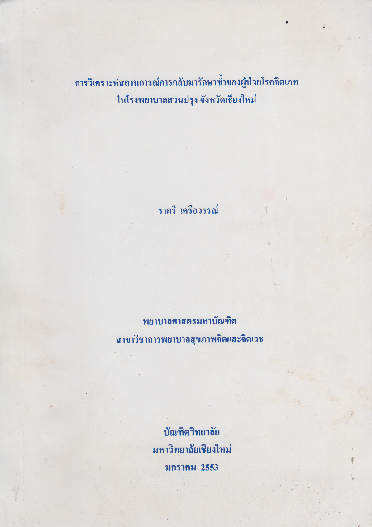 การวิเคราะห์สถานการณ์การกลับมารักษาซ้ำของผู้ป่วยโรคจิตเภทในโรงพยาบาลสวนปรุง จังหวัดเชียงใหม่/bSituational Analysis of Re-admission Among Patients with Schizophrenia at Suanprung Psychiatric Hotpital, Chiang Mai Province/ราตรี เครือวรรณ์
