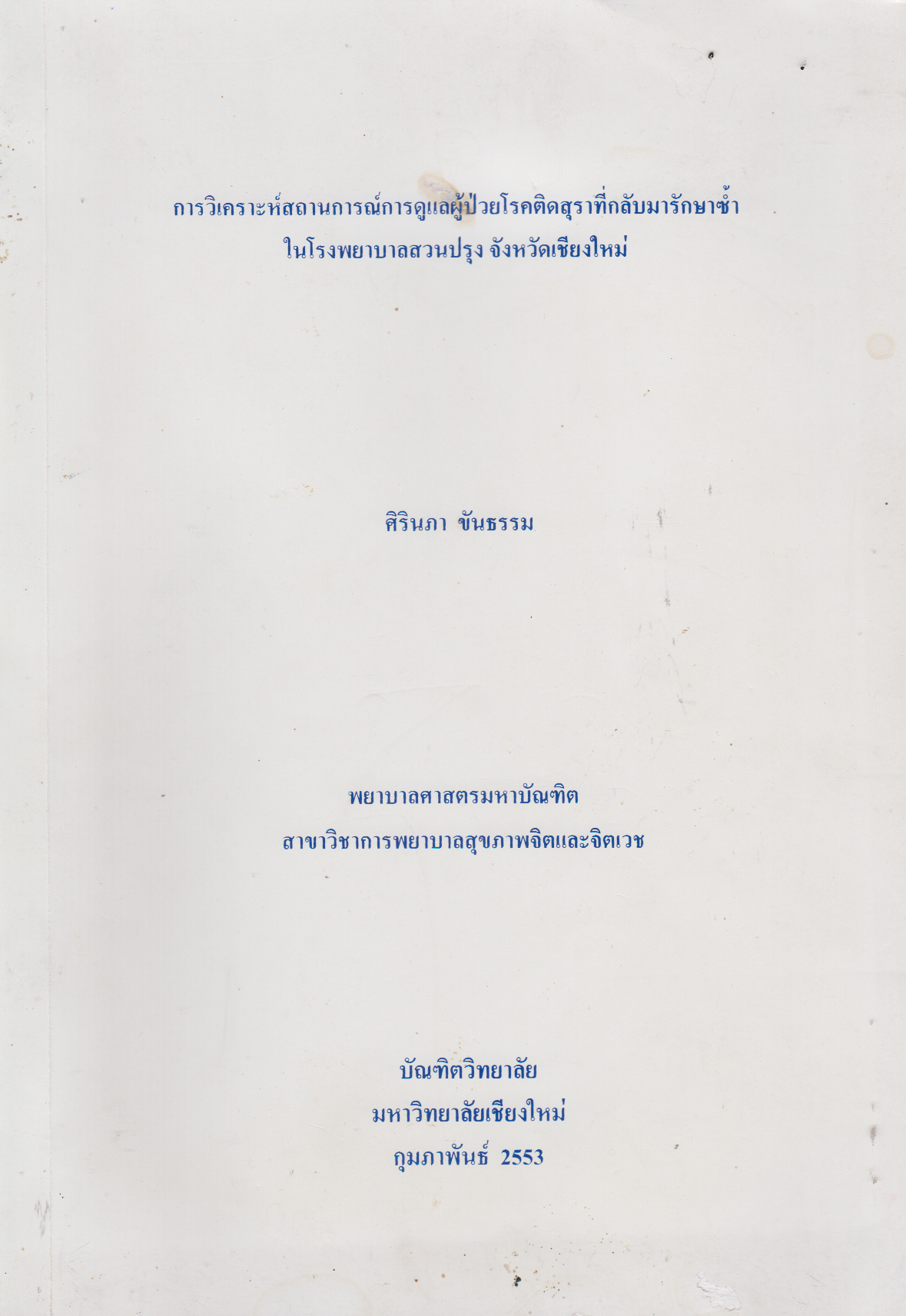 การวิเคราะห์สถานการณ์การดูแลผู้ป่วยโรคติดสุราที่กลับมารักษาซ้ำในโรงพยาบาลสวนปรุง จังหวัดเชียงใหม่/bSituational Analysis of Caring for Re-admitted Alcohol Dependent Patients at Suanprung Psychiatric Hotpital, Chiang Mai Province/ศิรินภา ขันธรรม |
