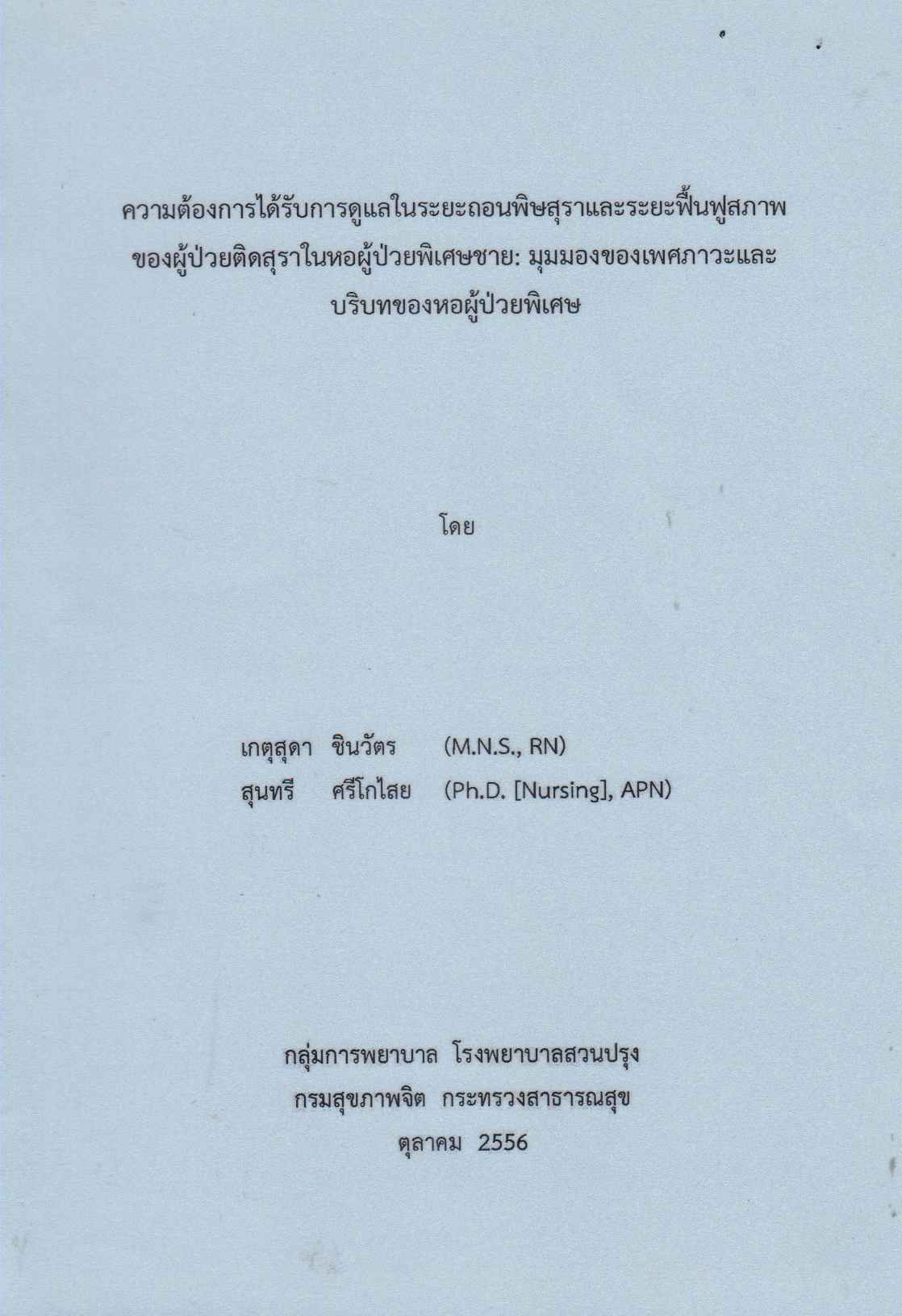 ความต้องการได้รับการดูแลในระยะถอนพิษสุราและระยะฟื้นฟูสภาพของผู้ป่วยติดสุราในหอผู้ป่วยพิเศษชาย:มุมมองของเพศภาวะและบริบทของหอผู้ป่วยพิเศษ / เกตุสุดา ชินวัตร,สุนทรี ศรีโกไสย