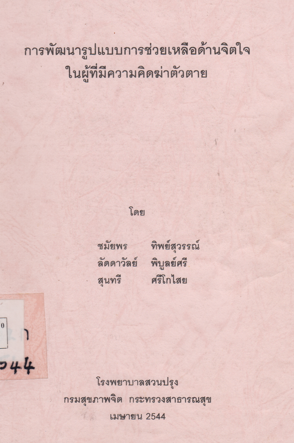 การพัฒนารูปแบบการช่วยเหลือด้านจิตใจในผู้ที่มีความคิดฆ่าตัวตาย / ชมัยพร ทิพย์สุวรรณ์,ลัดดาวัลย์ พิบูลย์ศรี,สุนทรี ศรีโกไสย