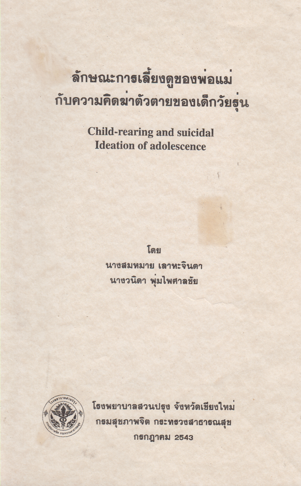 ลักษณะการเลี้ยงดูของพ่อแม่กับความคิดฆ่าตัวตายของเด็กวัยรุ่น Child-rearing and suicidal ideation of adolescence/ สมหมาย เลาหะจินดา,วนิดา พุ่มไพศาลชัย