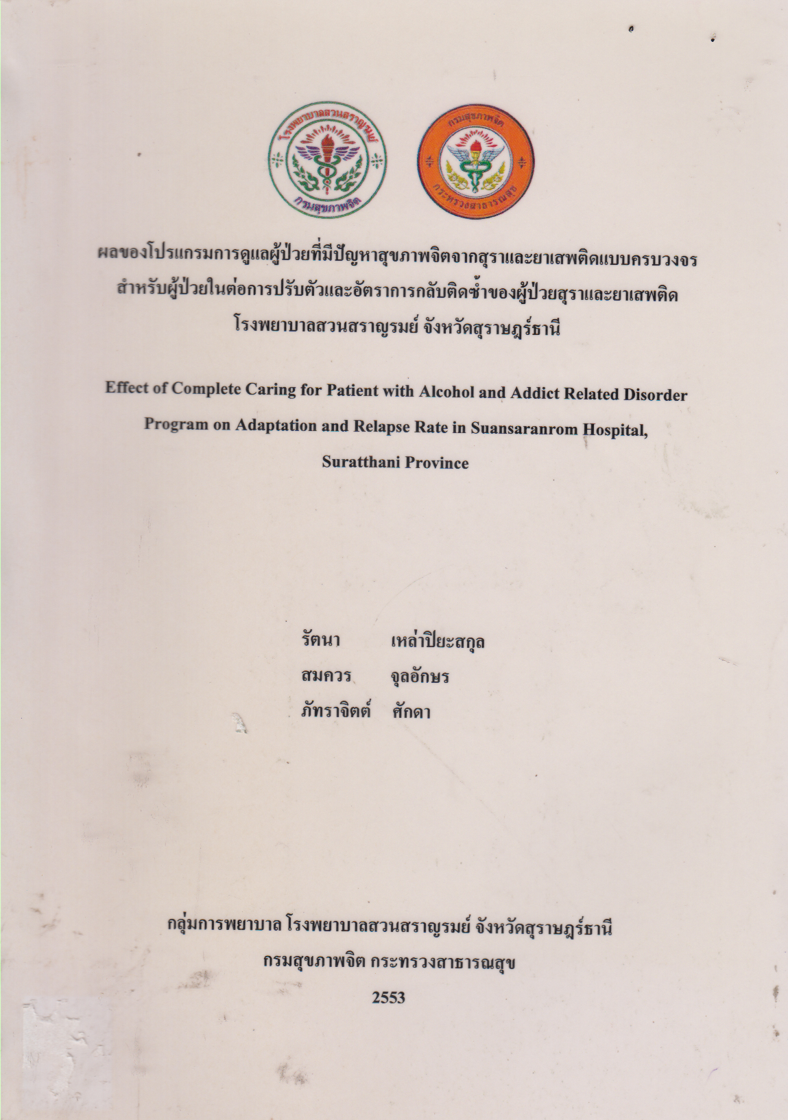 ผลของโปรแกรมการดูแลผู้ป่วยที่มีปัญหาสุขภาพจิตจากสุราและยาเสพติดแบบครบวงจร สำหรับผุ้ป่วยในต่อการปรับตัวและอัตราการกลับติดซ้ำของผุ้ป่วยสุราและยาเสพติด โรงพยาบาลสวนสราญรมย์ จังหวัดสุราษฎร์ธานี (Effect of complete caring for patient with alcohol and addict related disorder program on adaptation and relapse rate in suansaranrom hospital suratthani province รัตนา เหล่าปิยะสกุล,สมควร จุลอักษร,ภัทราจิตต์ ศักดา