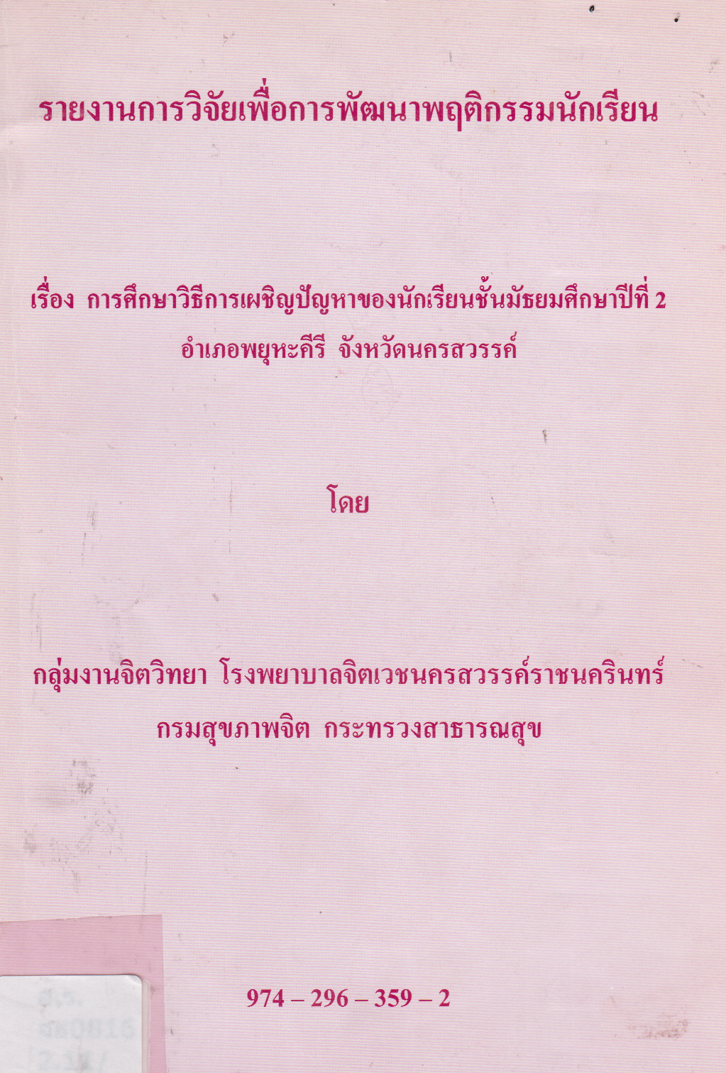 รายงานการวิจัยเพื่อการพัฒนาพฤติกรรมนักเรียน เรื่องการศึกษาวิธีการเผชิญปัญหาของนักเรียนชั้นมัธยมศึกษาปีที่ 2 อำเภอพยุหะคีรี จังหวัดนครสวรรค์ กลุ่มงานจิตวิทยา โรงพยาบาลจิตเวชนครสวรรค์ราชนครินทร์ |
