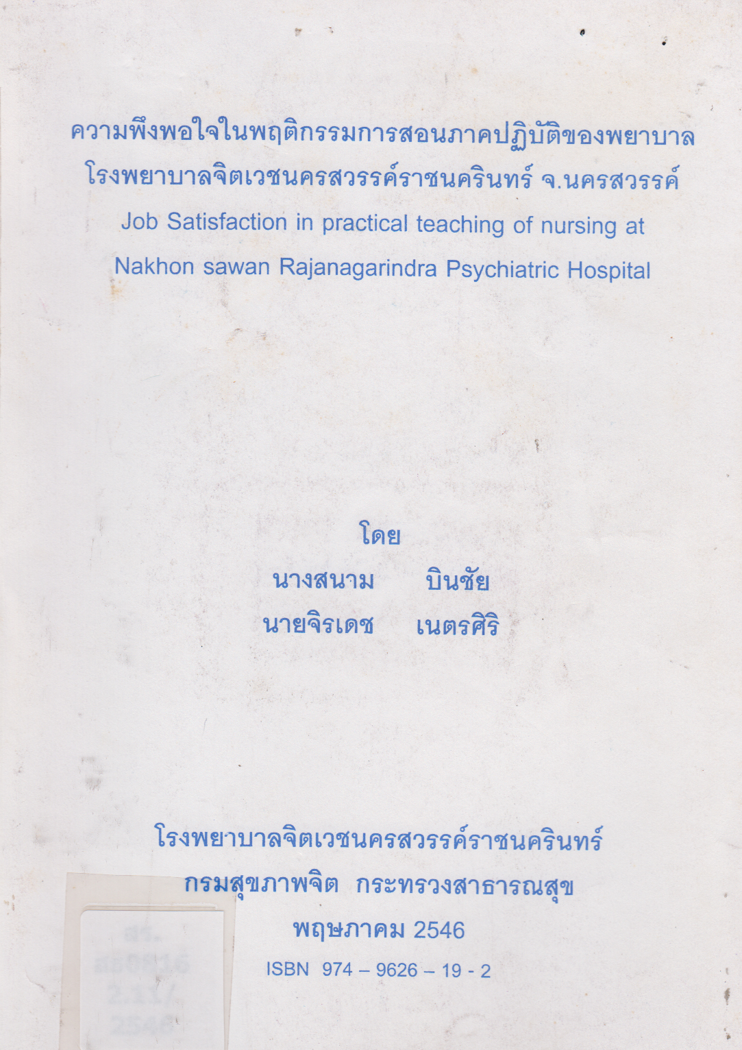 ความพึงพอใจในพฤติกรรมการสอนภาคปฏิบัติของพยาบาลโรงพยาบาลจิตเวชนครสวรรค์ราชนครินทร์ จังหวัดนครสวรรค์ Job satisfaction in practical teaching of nursing at nakhon sawan rejanagarindra psychiatric hospital สนาม บินชัย,จิรเดช เนตรศิริ