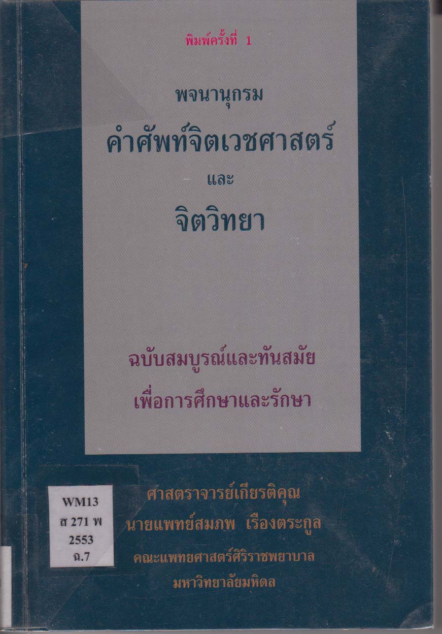พจนานุกรมคำศัพท์จิตเวชศาสตร์และจิตวิทยา / สมภพ เรืองตระกูล