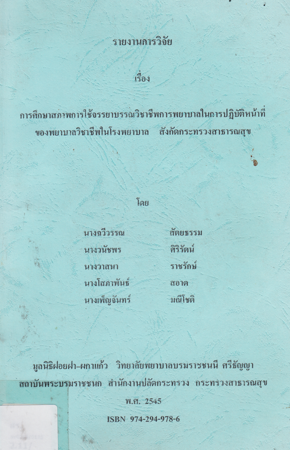 การศึกษาสภาพการใช้จรรยาบรรณวิชาชีพการพยาบาลในการปฏิบัติหน้าที่ของพยาบาลวิชาชีพในโรงพยาบาล สังกัดกระทรวงสาธารณสุข ฉวีวรรณ สัตยธรรม