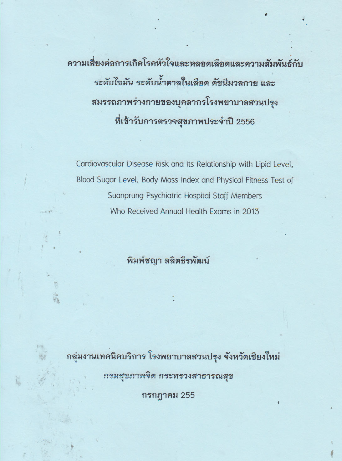 Cardiovascular disease risk and lth relationship with lipid level, blood sugar level, body mass index and physical fitness test of suanprung psychiatric hospital staff members who received annuai health exams in 2013 | | พิมพ์ลักษณ์ |