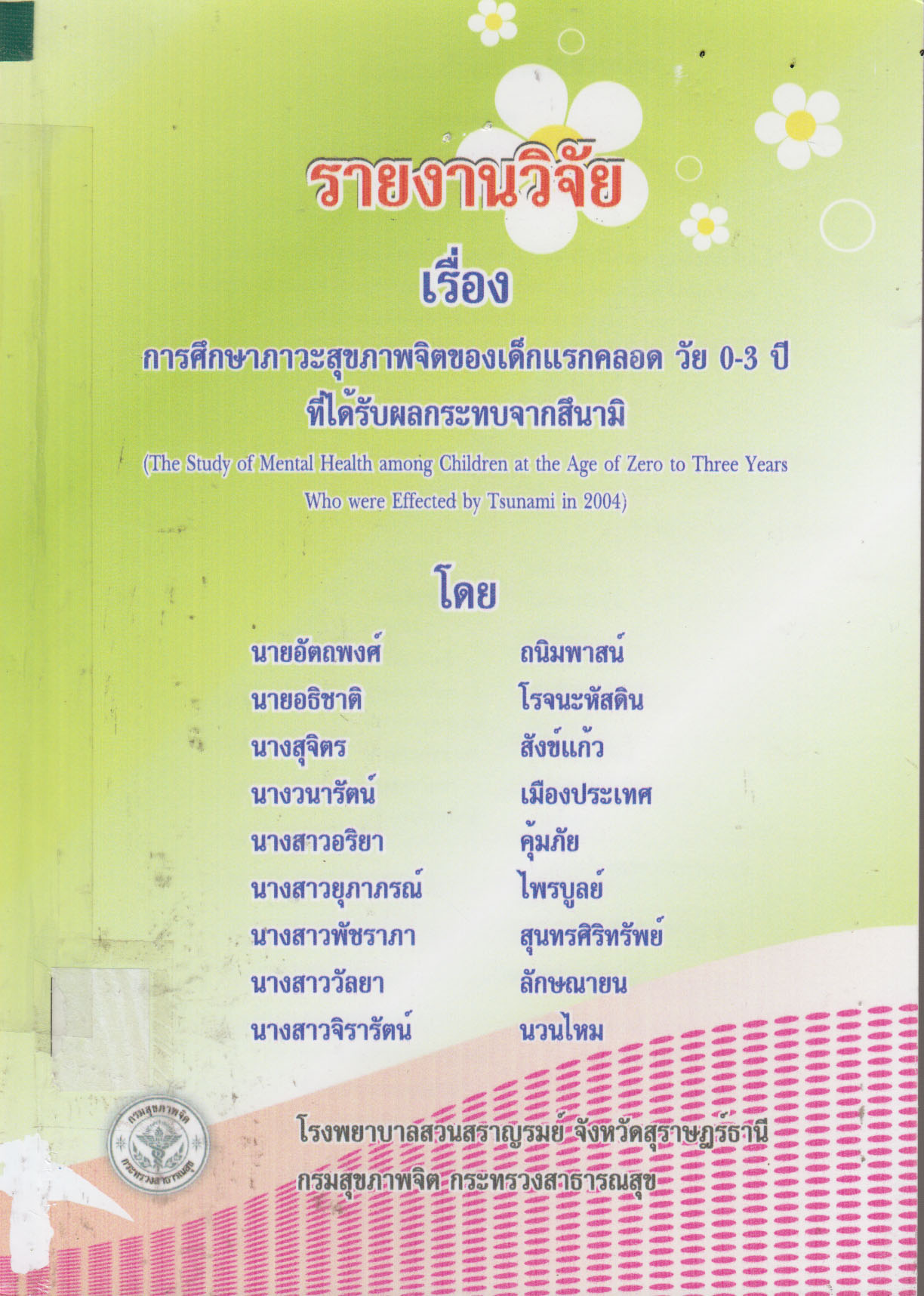 การศึกษาภาวะสุขภาพจิตของเด็กแรกคลอด วัย 0-3ปี ที่ได้รับผลกระทบจากสึนามิ(The study of mental health among children at the age of zero to three years who were effectad by tsunami in 2004). / อัตถพงศ์ ถนิมพาสน์,อธิชาติ โรจนะหัสดิน,สุจิตร สังข์แก้วและคณะ |