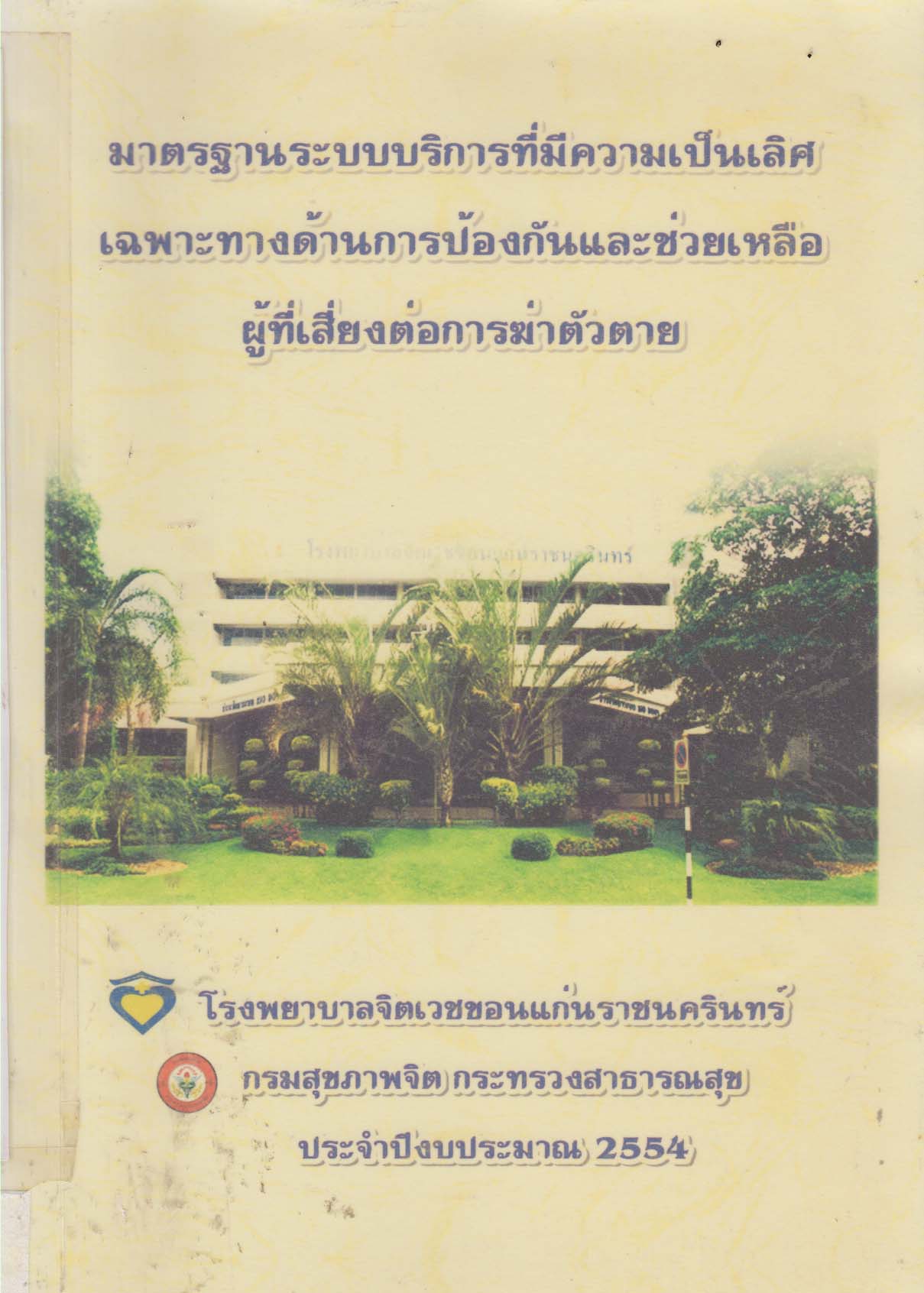 มาตรฐานระบบบริการที่มีความเป็นเลิศเฉพาะทางด้านการป้องกันและช่วยเหลือผู้ที่เสี่ยงต่อการฆ่าตัวตาย โรงพยาบาลจิตเวชขอนแก่นราชนครินทร์ |