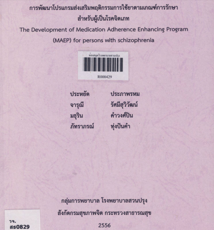 การพัฒนาโปรแกรมส่งเสริมพฤติกรรมการใช้ยาตามเกณฑ์การรักษาสำหรับผู้เป็นโรคจิตเภท = The development of Medication Adherence Enhancing Program (MAEP) for persons with schizophrenia/ ประหยัด ประภาพรหม, จารุณี รัศมีสุวิวัฒน์, มธุริน คำวงศ์ปิน และ ภัทราภรณ์ ทุ่งปันคำ |