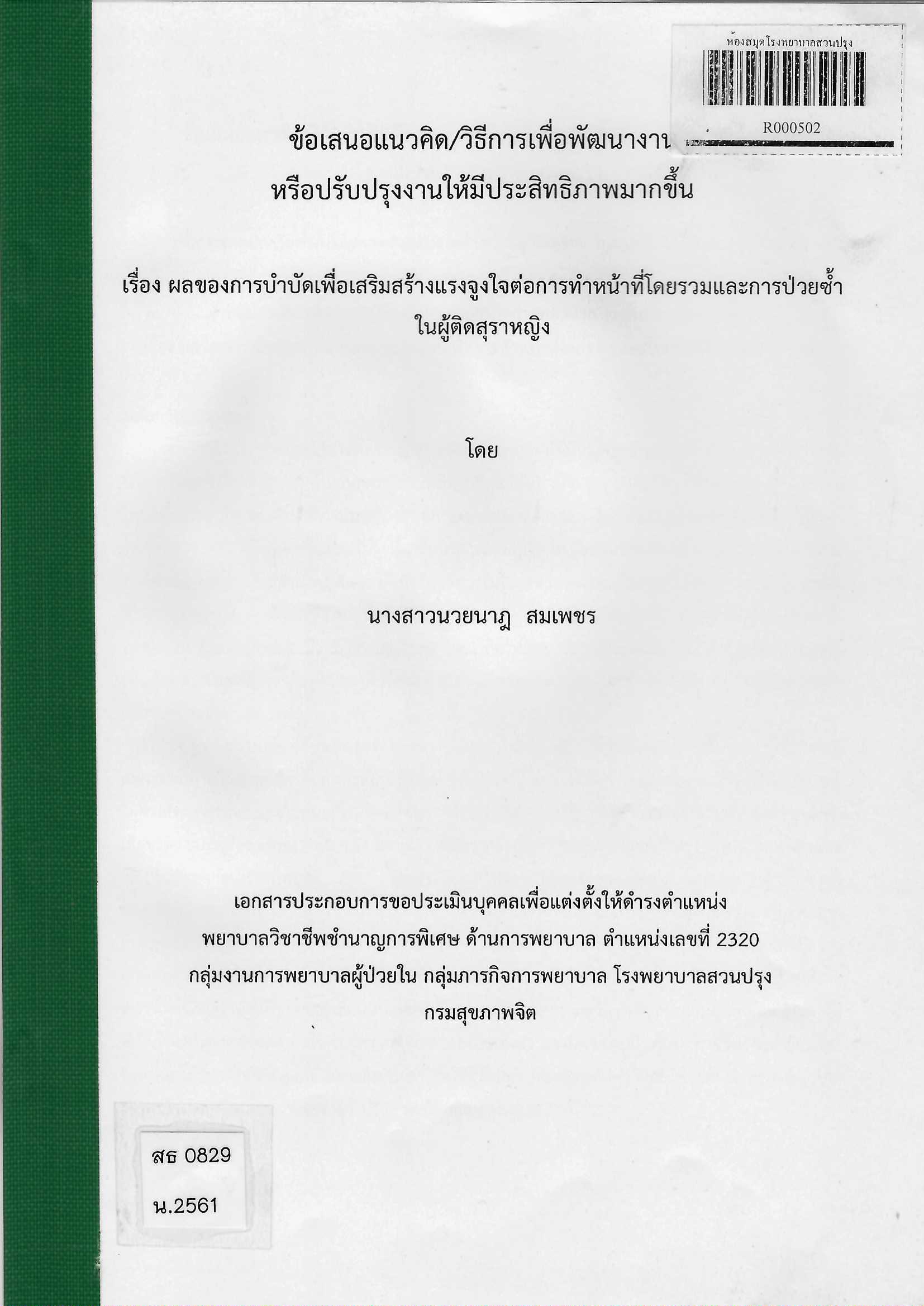 ข้อเสนอแนวคิด / วิธีการเพื่อพัฒนางาน เรื่อง ผลของการบำบัดเพื่อเสริมสร้างแรงจูงใจต่อการทำหน้าที่โดยรวมและการป่วยซ้ำในผู้ติดสุราหญิง,2561 นวยนาฏ สมเพชร