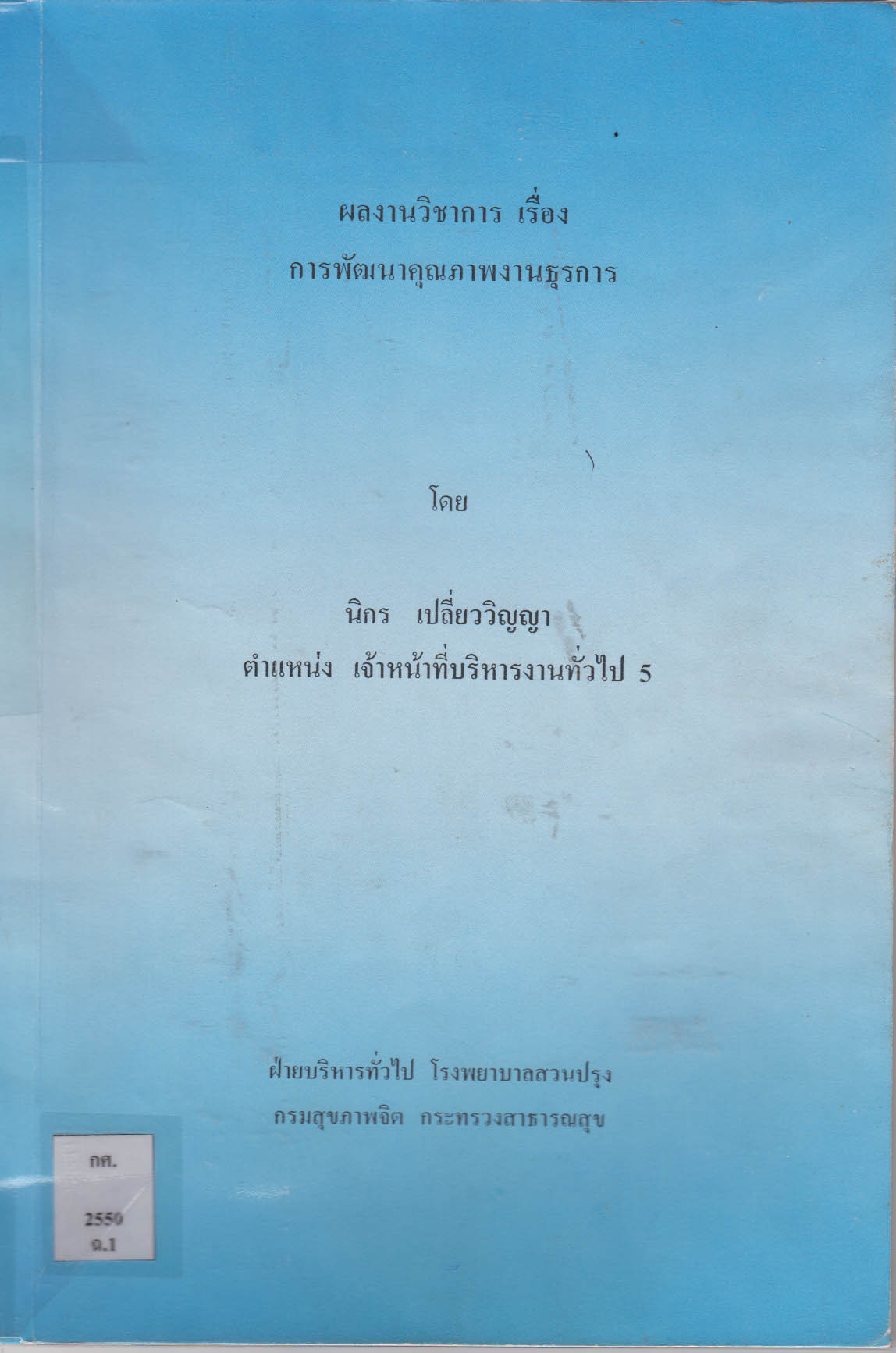| รายการใกล้เคียง ชื่อเรื่อง [การพัฒนาคุณภาพงานธุรการ] ผู้แต่ง [นิกร เปลี่ยววิญญา] |